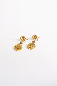 Designed in Australia, The Gold Fierce Folklore Coin Earrings embraces ancient idols and modern heirlooms, forged in magic and dripping with signature iconography. These opulent coin earrings, lavishly gilded in 18K gold, scintillate with coin and CAMILLA custin motifs. Crafted with signature elegance, they seamlessly blend ancient illusion with CAMILLA iconic allure, crafted for wild hearts and soul seekers - Gilded In 18K Gold - Solid Brass Base - Hand Cut Cubic Stones - Custom Design Inspired by CAMILLA - High Clarity And Brilliance - Coin Detail - Length: 4.5cm SKU 00037694-GOLDSUNG-O/S Size and Fit Length: 4.5cm Fabric and Care MAIN: 40% BRASS, 30% FRESHWATER PEARL, 15% CUBIC ZIRCONIA, 15% ENAMEL