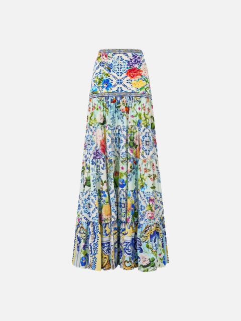 Designed in Australia, The Saints And Sisters Flared Hem Jersey Skirt celebrates Portugal’s architectural grandeur with a touch of the wild—leopard print meets sacred artistry, blending nostalgia and wanderlust in every hand-illustrated design. Lovingly handcrafted, this jersey skirt features a fitted yoke and a long-length flared hem, completed with an invisible back zipper for a seamless finish. - Fitted Yoke - Long Length - Flare Panelled Skirt - Centre Back Invisible Zipper - Crystal Embellishment - Non-Sheer SKU 00036167-SAINSIST-XXS Size and Fit Designed and fitted true to size, take your normal size Fabric and Care 96% RAYON 4% ELASTANE Rayon spandex crepe embodies medium weight and structure. The slightly textured surface and subtle stretch create lavishly sleek silhouettes with soft tailored elements.