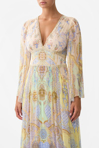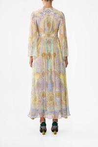 The East Of Istanbul Flared Sleeve Dress is a handcrafted silk silhouette designed by our in house artisans. Reimagined in an exclusive limited edition print, our full length maxi dress features a shaped waistband and long, flared sleeves for effortless movement. Finished beautifully with shirred details to contour with comfort. - 100% Silk - Crystal Embellishment - Long Flared Sleeves - Shirred Back Waistband - Shaped Front Waistband SKU 00037297-EASTISTA-XXS Size and Fit Our model is 5'10 (178cm) tall and wears a size S (AU 10). Bust: 40in (101.6cm) Waist: 26.5in (67cm) Hips: 38in (96.5cm) Designed and fitted true to size, take your normal size. Fabric and Care SELF-100% SILK, CONTRAST-100% SILK, LINING -100% SILK Silk crinkle chiffon is a sheer, lightweight fabric with a textured surface, crafted for a fluid drape with delicate stretch and a soft bounce.