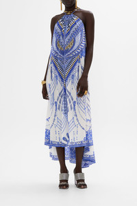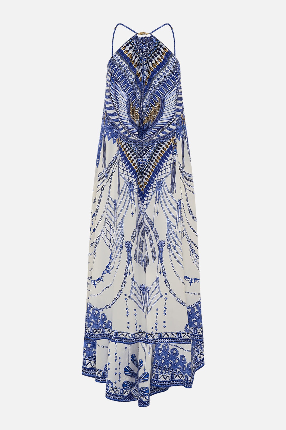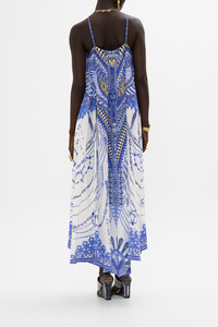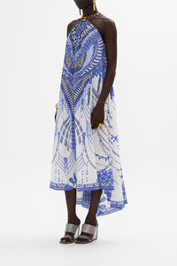 Designed in Australia, The Dancing With Daylight Gather Neck Hardware Maxi Dress embraces the ethereal charm of ancient realms. Blue and white hues mingle with delicate flecks of gold, capturing the timeless elegance and divine light of deities. Lovingly handcrafted, this luxury CAMILLA silk maxi dress features a bespoke hardware ring detail that creates a gathered neckline that falls into a relaxed A-line maxi silhouette. Adjustable straps and a back neckline allow for an opulently personalized fit. - Relaxed Fit - Full Length With High Low Hem - Gathered Neckline - Hardware Ring - Crystal Embellishment SKU 00034440-DANDAYL-XS Size and Fit Our model wears a CAMILLA S and is 5'10 (178cm) tall. Her standard dress size is an AU 10. She has a 32in (83cm) bust, 35in (89.5cm) hips and a 25in (66cm) waist. Camilla S = AU10 / UK10 / US6 Fabric and Care 100%SILK With its subtly textured surface, silk crepe is our core fabrication made perfect for versatile wear. With its ability to hold alternative ways to wear, this decadent fabric drapes elegantly off the body whilst keeping you cool with its breathable nature.