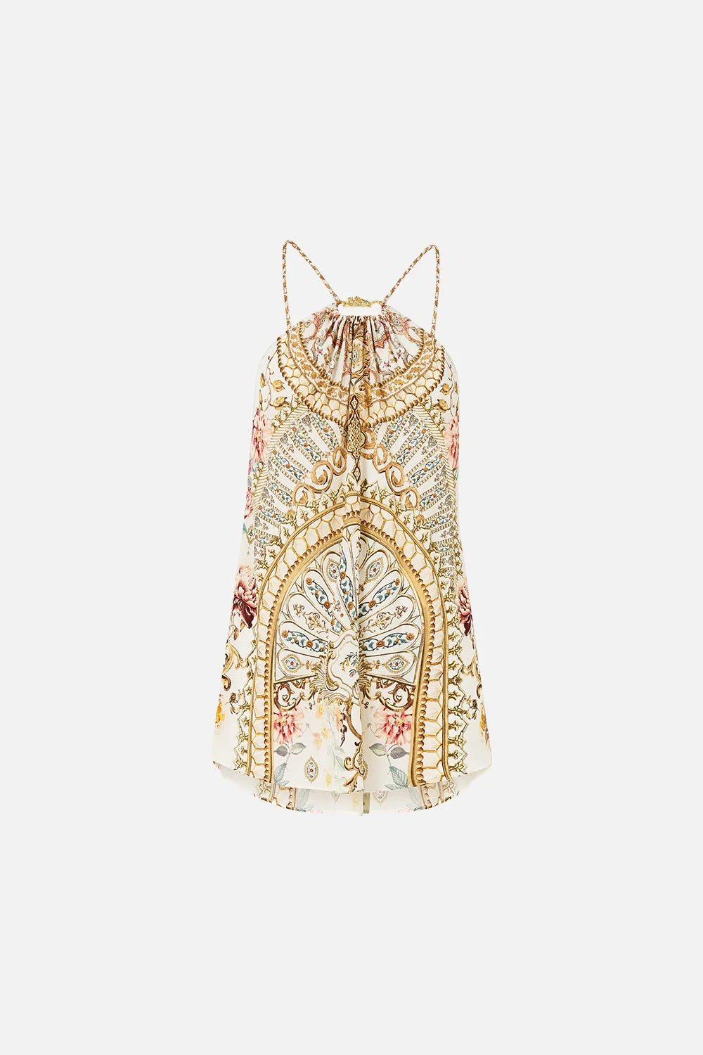 The Ottoman Dynasty Gather Neck Hardware Top is a handcrafted silk silhouette designed by our in house artisans. Reimagined in an exclusive limited edition print, our gather neck top features a softly gathered neckline and bespoke CAMILLA hardware that anchors the design. Adjustable straps add versatility and comfort. - 100% Silk - Relaxed Fit - Gathered Neckline - Bespoke Camilla Hardware - Adjustable Straps SKU 00036798-OTTODYNA-XXS Size and Fit Our model is 5'10 (178cm) tall and wears a size S (AU 10). Bust: 40in (101.6cm) Waist: 26.5in (67cm) Hips: 38in (96.5cm) Designed as a relaxed fit, take your normal size, or select one size smaller for a neater fit. Fabric and Care 100% SILK With its subtly textured surface, silk crepe is our core fabrication made perfect for versatile wear. With its ability to hold alternative ways to wear, this decadent fabric drapes elegantly off the body whilst keeping you cool with its breathable nature.