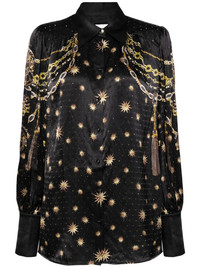 graphic-print silk shirt Highlights - Black/multicolour - Silk - Satin finish - All-over graphic print - Crystal embellishment - Classic collar - Front button fastening - Long sleeves - Buttoned-cuff sleeves - Curved hem Imported Composition Silk 100% SIZE & FIT Model measurements Height 5 ft 10 in(1.77 m) Bust/Chest 31.49 in(80 cm) Hips 35.43 in(90 cm) Waist 25.19 in(64 cm) FittingInformation Designed to be unstructured, offering a loose fit throughout Made from a lightweight non-stretch fabric This piece fits true to size – take your usual size Washing instructions Dry Clean Only