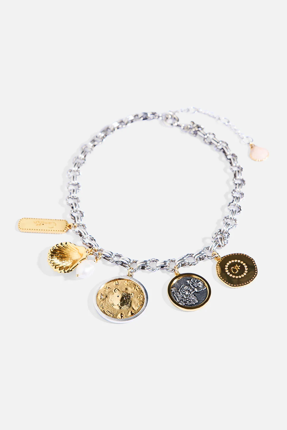 Designed in Australia, The Gypset Glitterati Charm Necklace introduces a reverie of the sun, soul and heart, exuding nomadic spirit and scintillating charm. Lovingly handcrafted, this lavish necklace comprosies a custom design inspired by CAMILLA and gilded in 18K real gold. 2 sided coins beautifully adorn this forever keepsake. - Gilded in 18K Gold - Solid Brass Base - Custom Design Inspired by CAMILLA - 2 Sided Coins SKU 00039169-GOLDSUNG-O/S Fabric and Care MAIN: 70% BRASS, 15% ENAMEL, 10% CUBIC ZIRCONIA, 5% FRESHWATER PEARL