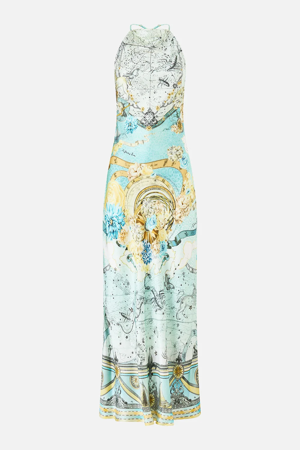 The My Lucky Stars Halter Chain Slip Dress is a handcrafted silk silhouette designed by our in house artisans. Reimagined in an exclusive limited edition print, this slip dress is cut on the bias to effortlessly skim the form, effortlessly falling to a full length hemline. It features a soft cowl neckline and an open back framed by a delicate lace halter strap, with lace detailing that adds a whisper of romance from every angle. - 100% Silk - Bias Cut - Full Length - Open Back With Chain Detail - Cowl Neck SKU 00037410-LUCKSTAR-XXS Size and Fit Our model is 5'10 (178cm) tall and wears a size S (AU 10). Bust: 40in (101.6cm) Waist: 26.5in (67cm) Hips: 38in (96.5cm) Designed and fitted true to size, take your normal size. Fabric and Care 100% SILK CHARMEUSE Silk satin embodies a sumptuously smooth finish that offers a rich buttery touch to the skin. As a result of the satin weaving technique, it masterfully creates a fuller bounce to the body and drape details.