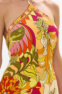 The Flower Child Society Long Jersey Halter Dress depicts a 70's inspired scene of vibrant orange imbued with statement retro florals. This luxury jersey maxi halter dress features a sleek neckline with fine straps upon the relaxed A line maxi length silhouette. Explore more from the Wonderkind collection. - Lovingly Handcrafted - Designed in Australia - CAMILLA Ready-To-Wear - Halter neck - Full length - Thin ties - Contrast neck band - Custom tassels SKU 00028904-FLOWCHIL-XXS Size and Fit Our model wears a CAMILLA S and is 5'10 (178cm) tall. Her standard dress size is an AU 10. She has a 32in (83cm) bust, 35in (89.5cm) hips and a 25in (66cm) waist. Camilla S = AU10 / UK10 / US6 Fabric and Care 96% VISCOSE 4% ELASTANE Rayon spandex crepe embodies medium weight and structure. The slightly textured surface and subtle stretch create lavishly sleek silhouettes with soft tailored elements.