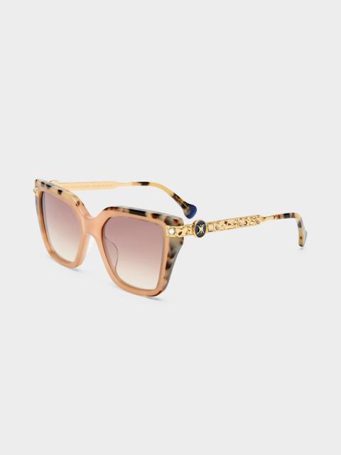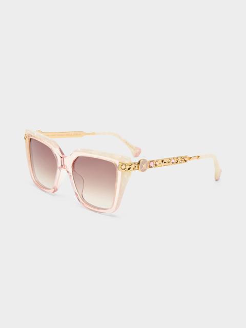 Designed in Australia, The Here Comes Trouble Sunglasses reveal a rosewater and vibrant ivory marble concoction, complimentary shades for sun setting dreamscapes and wanderlust spirits. Lovingly handcrafted, these bold D frame shades are designed for quiet charm and exquisite soirees with elevated temple detailing. The medium size fit frame features hand polished metal temples adorned with crystal and enamel detailing. The shades are complemented with moulded nose pads for fit and comfort and completed with a CAMILLA signature tip shape. < - D Frame Shape - Metal Temples - Crystal Embellishment - Contrast Lamination Tip Detailing - Frame Size 51 x 18 x 140mm - CAMILLA Hardcase and Cleaning Cloth SKU 00037674-ROSEWATERIVORYM-O/S Fabric and Care MAIN: 100% ACETATE