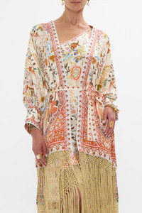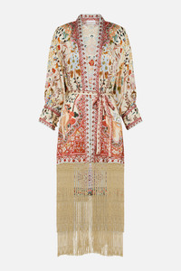 The In Honour Of Heirlooms High Low Hem Layer With Cuff depicts an intricate world of traditional lotuses, floral and arabesque motifs in soft pinks, neutrals and reds. This luxury CAMILLA silk kimono layer features a relaxed fit throughout the body with an open neckline and generously relaxed blouson sleeves echo effortless wearability for lavish layering. Explore more from the House Of The Sun collection. - Lovingly Handcrafted - Designed in Australia - CAMILLA Ready-To-Wear - Crystal embellishment - Midi length - Blouson sleeve with fitted cuff - Macrame fringing at hem - Drop shoulder seams - Waist tie - Luxury outer wear SKU 00029716-INHNRHRL-XS Size and Fit Our model wears a CAMILLA S and is 5'10 (178cm) tall. Her standard dress size is an AU 10. She has a 32in (83cm) bust, 35in (89.5cm) hips and a 25in (66cm) waist. Camilla S = AU10 / UK10 / US6 Designed as a relaxed fit take your normal size Fabric and Care 100% SILK