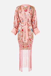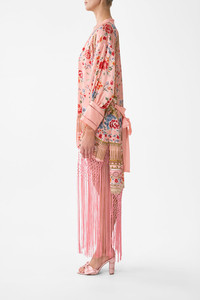 Designed in Australia, the Majestic Milla High Low Hem Layer With Cuff draws inspiration from the Majestic Cafe. Soft pinks evoke a romantic allure, capturing the essence of its storied prints. This luxury CAMILLA silk kimono layer features a relaxed fit throughout the body with an open neckline, generously relaxed blouson sleeves echo effortless wearability for lavish layering. - Relaxed Fit - Cuff With Buttons - Fringing Detail At Hem - Crystal Embellishment SKU 00035078-MAJEMILL-XS Size and Fit Designed as a relaxed fit—take your normal size, or select one size smaller for a neater fit. Fabric and Care 100% SILK CHARMEUSE Silk satin embodies a sumptuously smooth finish that offers a rich buttery touch to the skin. As a result of the satin weaving technique, it masterfully creates a fuller bounce to the body and drape details.