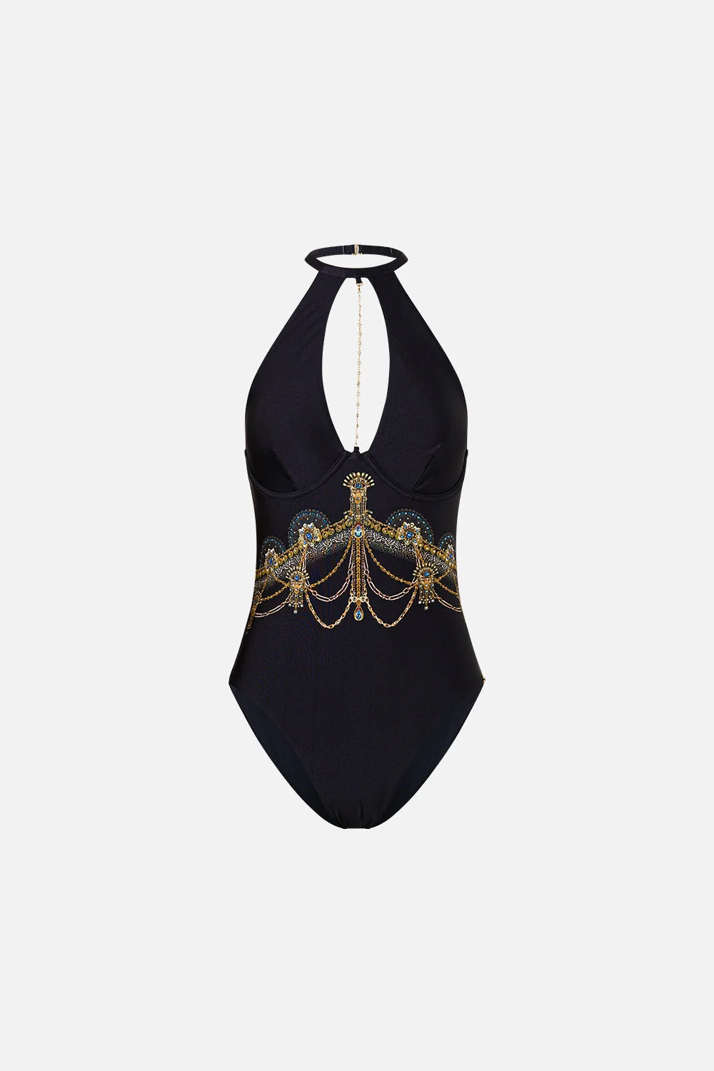 The Song Of The Solstice High Neck Halter Underwire One Piece With Chain is a handcrafted silhouette designed by our in house artisans. Reimagined in an exclusive limited edition print, our high neck halter one piece is made with C to D cups in mind. Featuring soft cups with underwire support and adjustable neck straps for a supportive fit, it's cut with a regular to high leg line and decorated with a delicate chain and crystal embellishments. - Fits C-D Cup - Soft Cups With Underwire Support, High Neck - Regular To High Leg Line, Moderate Bottom Coverage - Adjustable Neck Strap - Delicate Chain In Centre Front - Crystal Embellishment SKU 00037545-SONGSOLS-XS Size and Fit Our model is 5'10 (178cm) tall and wears a size S (AU 10). Bust: 40in (101.6cm) Waist: 26.5in (67cm) Hips: 38in (96.5cm) Fabric and Care MAIN: 82% REGENERATED POLYAMIDE, 18% ELASTANE
