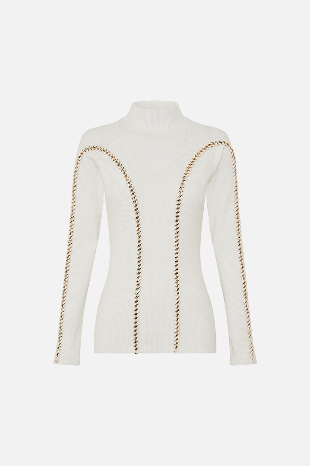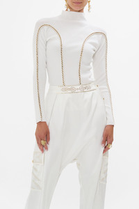 The Valley Of The Queens High Neck Knit Top emulates a world of rich ivory and opulent golden highlights. A luxury knit top that features a fitted silhouette with a chic mock neckline and full length sleeves. Adorned with chain insert details for signature CAMILLA decadence. - Lovingly handcrafted - Designed in Australia - CAMILLA ready-to-wear - True Knit - CAMILLA Printed - Mock neck - Decorative chain insert detail - Long sleeve - Hip Length SKU 00030219-VALLOTQU-S Size and Fit Our model wears a CAMILLA S and is 5'10 (178cm) tall. Her standard dress size is an AU 10. She has a 32in (83cm) bust, 35in (89.5cm) hips and a 25in (66cm) waist. Camilla S = AU10 / UK10 / US6 Designed fitted true to size , take your normal size Fabric and Care 78% VISCOSE 22% ELITE