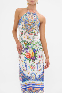 Designed in Australia, the Tiles Darls High Neck Long Dress reads the language of florals and tiles, blue and orange hues intertwine, a celebration of artisan hands and enduring beauty. Lovingly handcrafted, this high-neck dress features a gathered design and scoop back with crossover tie. Side splits add movement while crystal embellishments lend a touch of opulence to this long-length silhouette. - Gathered High Neck - Scoop Back With Cross Over Tie - Side Splits - Long Length - Crystal Embellishment SKU 00035751-TILEDARL-XS Fabric and Care MAIN: 34% RECYCLED NYLON, 34% NYLON, 32% ELASTANE