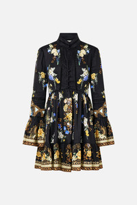 The Ottoman Elegance High Neck Short Dress With Ruffle Cuff is a handcrafted linen silhouette designed by our in house artisans. Reimagined in an exclusive limited edition print, our high neck mini dress features long sleeves that are adorned with ruffle cuffs and a tiered skirt with a comfortable, stretch waist. It's finished with front button fastening and a fitted bodice for refined, effortless wear. - 82% Linen, 18% Silk - Fitted Bodice With Tiered Skirt - Long Sleeve With Ruffle Cuff - Stretch Waist For Easy Fit - Front Button Fastening SKU 00036577-OTTOELEG-XXS Size and Fit Our model is 5'10 (178cm) tall and wears a size S (AU 10). Bust: 40in (101.6cm) Waist: 26.5in (67cm) Hips: 38in (96.5cm) Fabric and Care 82% LINEN 18% SILK Silk Linen is a beautiful combination of natural fabrics which blend into a luxurious, soft and smooth texture. Cool to touch with a subtle sheen and lustre from silk components, its breathable, durable and has a crisp, textured hand feel.