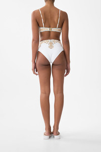 The Ottoman Dynasty High Waist Bikini Bottom With Pleat Waist Trim is a handcrafted silhouette designed by our in house artisans. Reimagined in an exclusive limited edition print, our high waisted bikini bottom features a pleated front band, high leg line and moderate bottom coverage. Crafted in a dry handle heavyweight fabrication, this bikini is finished with gold hardware and intricately placed crystal embellishment. - High Waist - High Leg Line, Moderate Bottom Coverage - Front Band, Cinched Waist Detail - Dry Handle Heavy Weight Fabrication - Hammered Gold Hardware Detail At Front - Crystal Embellishment SKU 00037401-OTTODYNA-XS Size and Fit Our model is 5'10 (178cm) tall and wears a size S (AU 10). Bust: 40in (101.6cm) Waist: 26.5in (67cm) Hips: 38in (96.5cm) Fabric and Care MAIN: 79% REGENERATED POLYAMIDE, 21% ELASTANE
