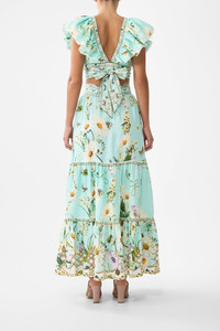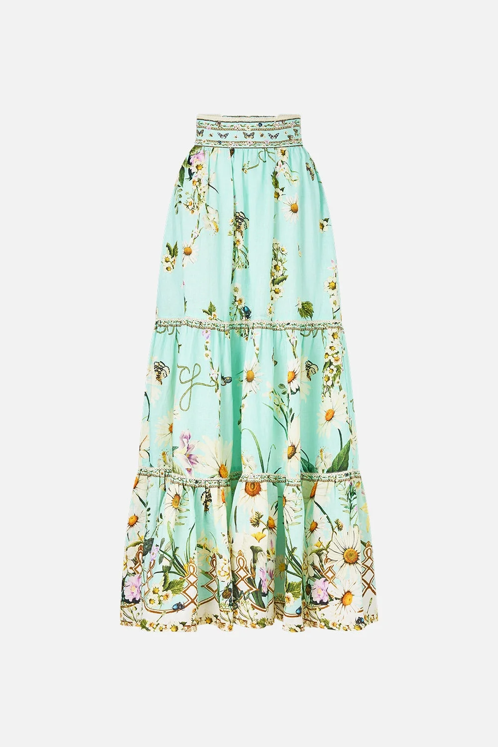 Designed in Australia, the Floral Freefall High Waisted Tiered Skirt floats on a dreamscape of baby blue and purple. Botanical motifs cascade across embroidered textiles, capturing the poetry of wildflower fields. Lovingly handcrafted, this luxury maxi skirt features a high-waisted silhouette with tiered panels and delicate lace inserts. Adorned with lavish embroidery details, this maxi skirt exudes signature CAMILLA opulence. - High Waisted - Tiered Skirt - Maxi Length - Back Zip Closure SKU 00035367-FLORFREE-XXS Size and Fit Our model wears a CAMILLA S and is 5'10 (178cm) tall. Her standard dress size is an AU 10. She has a 32in (83cm) bust, 35in (89.5cm) hips and a 25in (66cm) waist. Camilla S = AU10 / UK10 / US6 Fabric and Care 100% LINEN Made from flax fibres, this lightweight natural fibre offers a timeless aesthetic that adds durability and longevity to any wardrobe. Its breathability keeps your skin cool, minimises moisture and ensures effortless comfort.