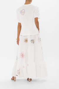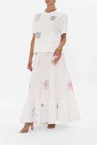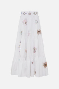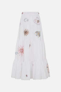 Designed in Australia, The Living In Colour High Waisted Tiered Skirt greets you into a cacophony of cheerful chaos, featuring hand painted suns, hearts, crescent moons, and palm fronds, embroidery motifs resting delicately on an ivory canvas. Lovingly handcrafted, this luxury maxi skirt features a high-waisted silhouette with tiered panels and delicate lace inserts. Adorned with lavish embroidery details, this CAMILLA maxi skirt exudes signature opulence. - High Waisted - Tiered Skirt - Maxi Length - Centre Back Zip With Comfort Elastic - Crystal Embellishment - Hand Embroidery SKU 00032255-LIVINCOL-XXS Size and Fit Our model wears a CAMILLA S and is 5'10 (178cm) tall. Her standard dress size is an AU 10. She has a 32in (83cm) bust, 35in (89.5cm) hips and a 25in (66cm) waist. Camilla S = AU10 / UK10 / US6 Fabric and Care 100%COTTON