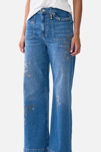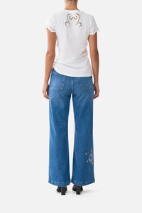 The Talismans Of Turkiye High Waisted Flare Denim is a handcrafted cotton silhouette designed by our in house artisans. Reimagined in an exclusive limited edition print, these embellished jeans are cut high waisted and elongate into a flared leg. Crafted with flexible denim for effortless wear, it features braided pocket edging, custom CAMILLA hardware and crystal motifs for decadent detail. - High Rise - Flared Leg - Braided Pocket Edging - Crystal Motifs - Custom Camilla Hardware - Stretch Denim SKU 00041114-DENIM-24 Size and Fit Our model wears a CAMILLA 28 and is 5'10 (178cm) tall. Her standard dress size is an AU 10. She has a 32in (83cm) bust, 35in (89.5cm) hips and a 25in (66cm) waist. Camilla 28 = AU10 / UK10 / US6 Our More to Love Model wears a CAMILLA Size 34 and is 5'9 (182cm) tall. Her standard dress size is a AU 20. She has a 42in (107cm) bust, 35.8in (91cm) waist and 46in (118cm) hips. CAMILLA 34 = AU 16. Fabric and Care 43% VISCOSE, 33% COTTON, 17% LYOCELL, 5% POLYESTER, 2% ELASTANE