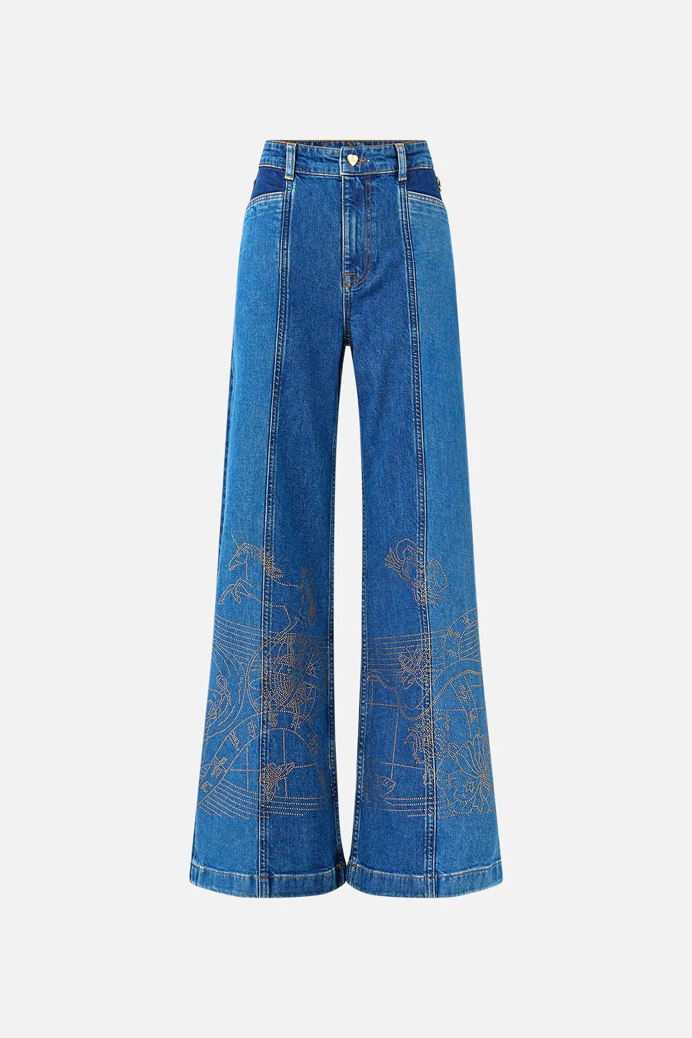 The Denim Jenna Zodiac Zone High Waisted Flare is a handcrafted cotton silhouette designed by our in house artisans. Reimagined in an exclusive limited edition print, these denim jeans are cut high waisted and then elongate into a flared leg. Featuring a heart shaped patchwork detail at the back and it's finished with crystal embellishments for luminous detail. - 100% Cotton - High Rise - Flared Leg - Heart Patchwork At Back - Crystal Embellishment SKU 00041103-DENIM-24 Size and Fit Our model wears a CAMILLA 28 and is 5'10 (178cm) tall. Her standard dress size is an AU 10. She has a 32in (83cm) bust, 35in (89.5cm) hips and a 25in (66cm) waist. Camilla 28 = AU10 / UK10 / US6 Our More to Love Model wears a CAMILLA Size 34 and is 5'9 (182cm) tall. Her standard dress size is a AU 20. She has a 42in (107cm) bust, 35.8in (91cm) waist and 46in (118cm) hips. CAMILLA 34 = AU 16. Designed and fitted true to size, take your normal size. Fabric and Care 100% COTTON Crafted from sustainable cotton and natural fibres, CAMILLA Denim is sourced from by our certified family-run fabric mill in Turkiye, the denim capital of the world. Each luxury denim silhouette is masterfully cut and embellished by our manufacturer in Istanbul, which has a storied 60-year history of fine denim artistry.