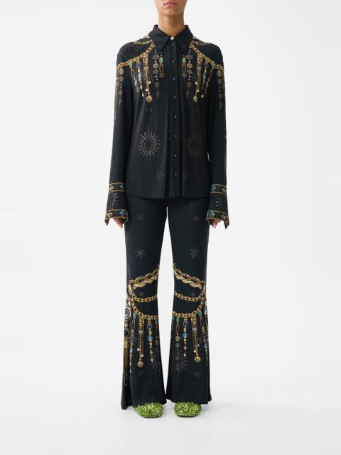 The Amulets And Alchemy Jersey Flared Pant is a handcrafted silhouette designed by our in house artisans. Reimagined in an exclusive limited edition print, this luxury pant is crafted with our flexible jersey and is cut fitted and flares, elongating the leg. It features side zip fastening for effortless wear and is finished with crystal embellishments for luminous detail. - Fit And Flare Style - Long Length - Side Zip Fastening - Crystal Embellishment SKU 00038432-AMULALCH-XS Size and Fit Our model is 5'10 (178cm) tall and wears a size S (AU 10). Bust: 40in (101.6cm) Waist: 26.5in (67cm) Hips: 38in (96.5cm) Fabric and Care 96% RAYON 4% SPANDEX Rayon spandex crepe embodies medium weight and structure. The slightly textured surface and subtle stretch create lavishly sleek silhouettes with soft tailored elements.