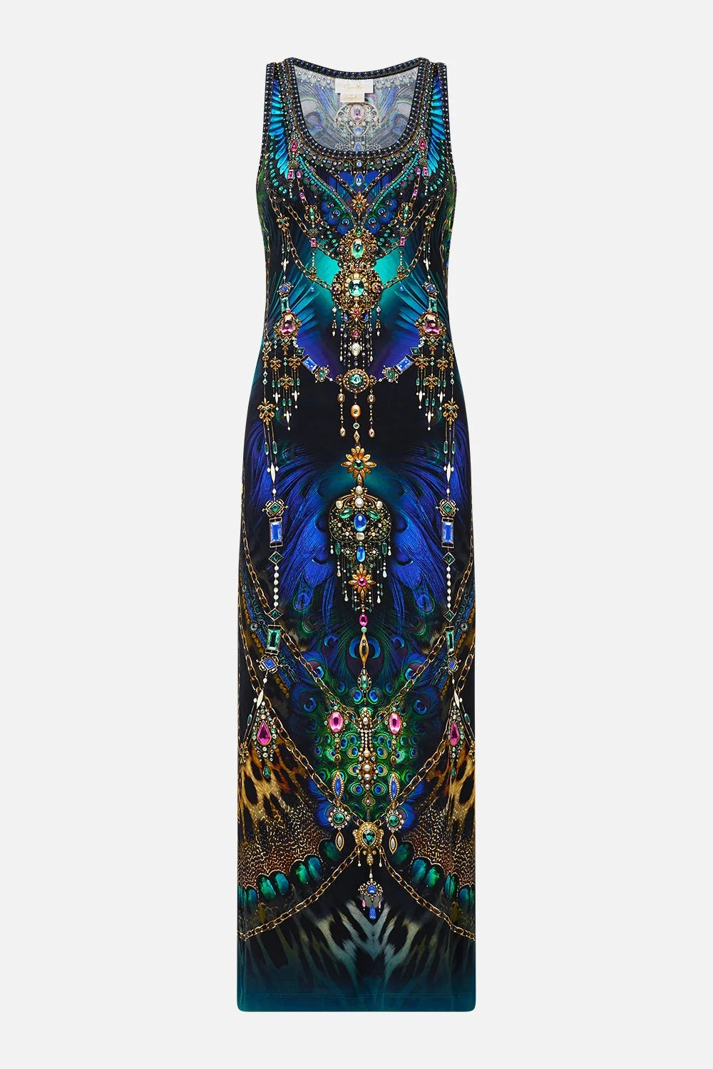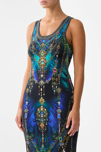 Designed in Australia, the Dominican Decadence Jersey Scoop Neck Tank Dress unfolds in decadent plumes and iridescent blues, teal waves shimmer like glass, capturing the sparkle of forgotten monuments. Lovingly handcrafted with meticulous attention to detail, this stunning dress features a scooped neckline that exudes grace, a figure-hugging midi length silhouette that caresses your curves and cinches your waistline for truly captivating allure - Sleeveless - Fitted Style - Scoop Front Neckline - Midi Length - Crystal Embellishment SKU 00035102-DOMIDECA-XXS Fabric and Care 92% VISCOSE 8% ELASTANE Viscose is a fibre crafted from the natural substance, cellulose, known for its softness, breathability and drape. It possesses a subtle sheen and is perfect for lightweight soft tailored silhouettes or more structured styles in heavier weights.