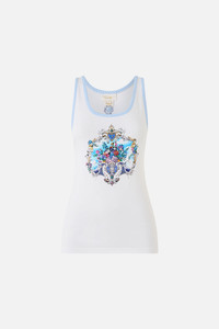 The Ottoman Opulence Jersey Scoop Neck Tank Top - White/Blue is a handcrafted silhouette designed by our in house artisans. Reimagined in an exclusive limited edition print, this luxury jersey tank top is cut to flatter the form in a fitted style. It features a scooped neckline that meets a racer back and is finished with intricately placed crystal embellishments for luminous detail. - Fitted Style - Scoop Front Neckline - Racer Back Style - Bra Friendly - Crystal Embellishment SKU 00039039-OTTOOPPU-XS Size and Fit Our model wears a CAMILLA O/S and is 5'10 (178cm) tall. Her standard dress size is an AU 10. She has a 32in (83cm) bust, 35in (89.5cm) hips and a 25in (66cm) waist. Designed and fitted true to size, take your normal size. Fabric and Care SHELL-95% COTTON 5% SPANDEX, CONTRAST-96% COTTON 4% ELASTANE Designed and fitted true to size, take your normal size.