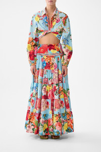 The Papers And Curious Capers Jersey Spliced Tiered Skirt is a handcrafted silhouette designed by our in house artisans. Reimagined in an exclusive limited edition print, this multi wear skirt has been crafted with contrasting fabrication and a fold over waistband for versatility. It features beautiful tiered panels that fall to a full length hemline and is finished with intricately placed crystal embellishment for luminous detail. - 100% Organic Cotton - Tiered Skirt - Fold Over Waistband - Multi Wear - Contrast Fabrication - Maxi Length - Crystal Embellishment SKU 00038157-PAPECAPE-XXS Size and Fit Our model is 5'10 (178cm) tall and wears a size S (AU 10). Bust: 40in (101.6cm) Waist: 26.5in (67cm) Hips: 38in (96.5cm) Fabric and Care 100% ORGANIC COTTON Organic cotton poplin is sumptuously smooth with a crisp, refined weave. This lightweight silken fabric drapes beautifully and is ideal for sleek contours and tailored, defined styles.