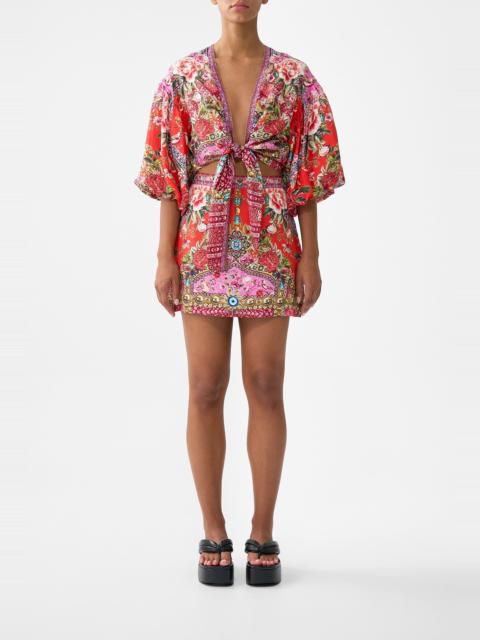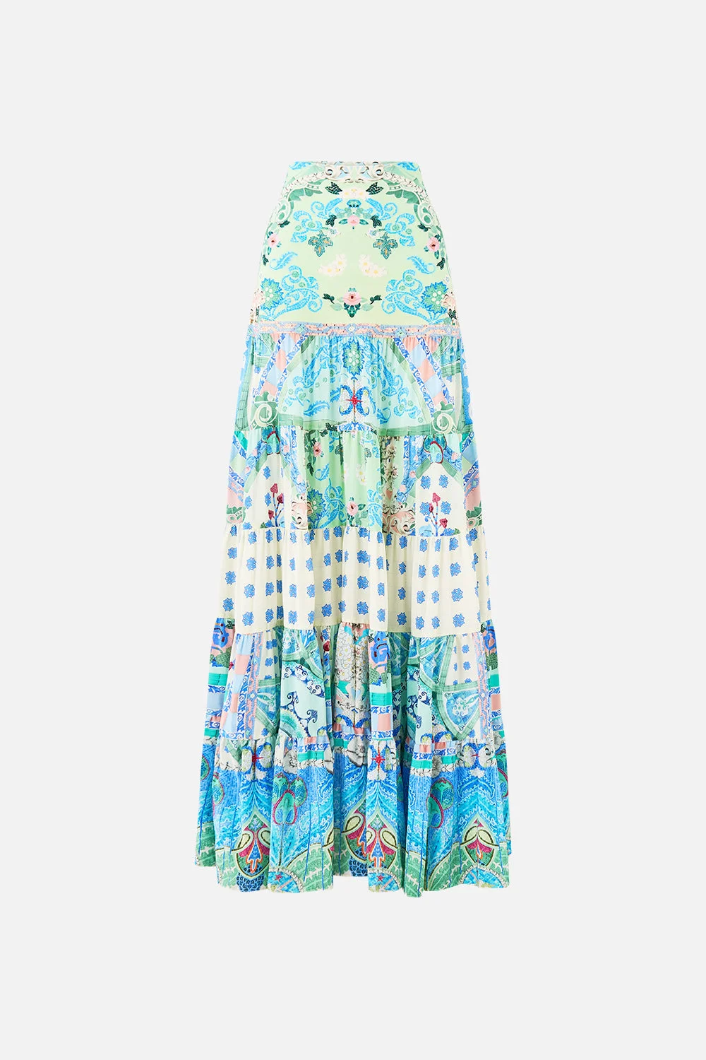 The Midsummer Mosaics Jersey Spliced Tiered Skirt is a handcrafted silhouette designed by our in-house artisans. Reimagined in an exclusive limited edition print, this multi wear skirt has been crafted with contrasting fabrication and a fold over waistband for versatility. It features beautiful tiered panels that fall to a full length hemline and is finished with intricately placed crystal embellishment for luminous detail. - 100% Silk - Tiered Skirt - Fold Over Waistband - Multi Wear - Contrast Fabrication - Maxi Length SKU 00040875-MIDSMOSA-XXS Size and Fit Our model is 5'10 (178cm) tall and wears a size S (AU 10). Bust: 40in (101.6cm) Waist: 26.5in (67cm) Hips: 38in (96.5cm) Fabric and Care 100% SILK With its subtly textured surface, silk crepe is our core fabrication made perfect for versatile wear. With its ability to hold alternative ways to wear, this decadent fabric drapes elegantly off the body whilst keeping you cool with its breathable nature.