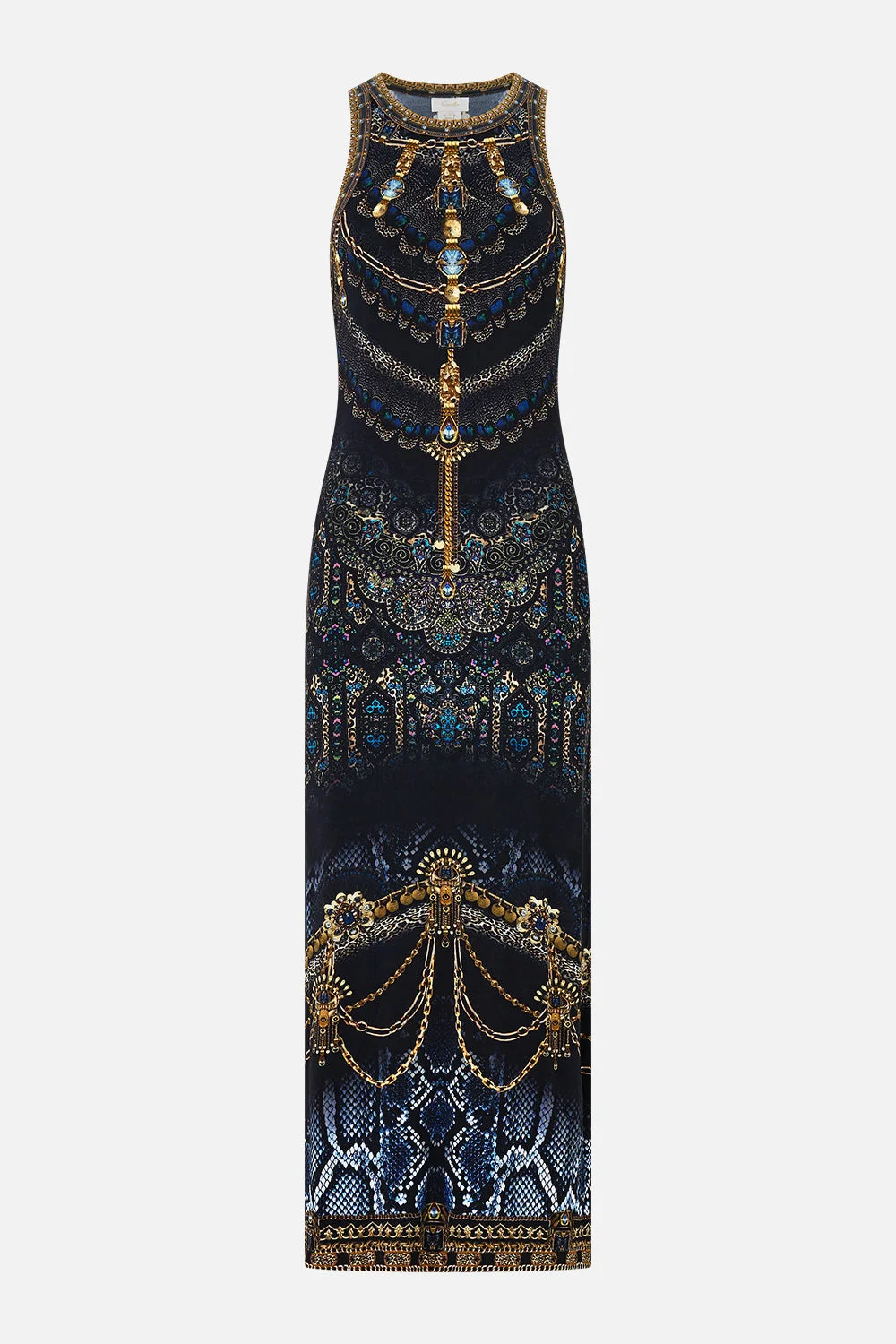 The Song Of The Solstice Jersey Tank Dress is a handcrafted silhouette designed by our in house artisans. Reimagined in an exclusive limited edition print, this sleeveless dress features a timeless tank neckline that flows into a figure-hugging midi length. Meticulously designed to caress the curves and cinch the waistline for captivating comfort. - Sleeveless - Scoop Neck - Fitted Style - Crystal Embellishment SKU 00036711-SONGSOLS-XXS Size and Fit Our model is 5'10 (178cm) tall and wears a size S (AU 10). Bust: 40in (101.6cm) Waist: 26.5in (67cm) Hips: 38in (96.5cm) RUNS TRUE TO SIZE Fabric and Care 92% VISCOSE 8% ELASTANE Viscose is a fibre crafted from the natural substance, cellulose, known for its softness, breathability and drape. It possesses a subtle sheen and is perfect for lightweight soft tailored silhouettes or more structured styles in heavier weights.