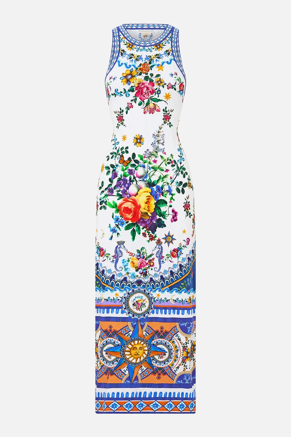 Designed in Australia, the Tiles Darls Jersey Tank Dress reads the language of florals and tiles, blue and orange hues intertwine, a celebration of artisan hands and enduring beauty. Lovingly handcrafted, this luxury jersey midi dress showcases a fitted silhouette that caresses your curves and falls to mid-calf length. A bodycon sleeveless style with slightly lowered armholes, a scooped neckline and slight racer back ensure everyday wearability. - Sleeveless - Scoop Neck - Fitted Style - Crystal Embellishment - Midi Length SKU 00034878-TILEDARL-XXS Size and Fit Designed and fitted true to size, take your normal size. Fabric and Care SHELL- '95% COTTON 5% SPANDEX , CONST- 96% COTTON 4% SPANDEX