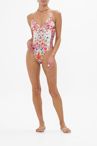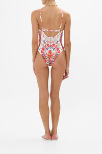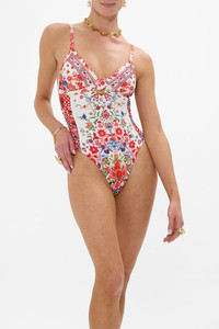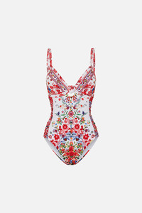 Designed in Australia, The Faith, Luck & Justice Knot Front Panelled One Piece draws you into the heart of Portuguese folklore—where the Barcelos Cockerel and vibrant fish motifs dance among colourful blooms and kitchy textiles, capturing market magic and tales of faith. Lovingly handcrafted, this knot front panelled one-piece offers sleek sophistication. Designed to fit C-D cups, it features a center knot, adjustable straps, and a back clip closure, while crystal embellishments and a regular leg line complete the look. - To Fit C-D Cup - Centre Front Knot Detail - Adjustable Back Clip Closure - Adjustable And Convertible Straps - Regular Leg Line - Crystal Embellishment - ECONYL® swim SKU 00034299-FATHJUST-XS Size and Fit Designed as a slim fit, take your normal size Fabric and Care MAIN: 85% POLYAMIDE, 15% ELASTANE