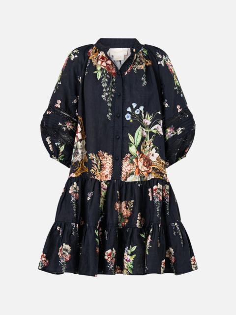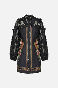 Designed in Australia, the Noble Endeavours Lace Sleeve Mini Dress embodies a white base fused with florals and golden arches, inspired by the arabesque opulence of the Palace of Queluz and its storied princess chambers. Lovingly handcrafted, this lace sleeve mini dress features front button detailing and a stand collar. Crystal embellishments add a luxurious touch to its refined design. - Lace Sleeve Mini Dress - Front Button Detail - Stand Collar - Crystal Embellishment SKU 00034816-NOBLENDE-XXS Size and Fit Our model wears a CAMILLA S and is 5'10 (178cm) tall. Her standard dress size is an AU 10. She has a 32in (83cm) bust, 35in (89.5cm) hips and a 25in (66cm) waist. Camilla S = AU10 / UK10 / US6 Fabric and Care 82% LINEN 18% SILK Silk Linen is a beautiful combination of natural fabrics which blend into a luxurious, soft and smooth texture. Cool to touch with a subtle sheen and luster from silk components, its breathable, durable and has a crisp, textured hand feel.