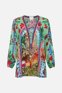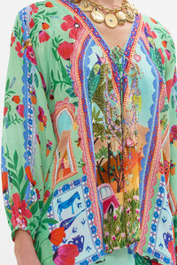 In this collaboration, CAMILLA artisans come together with artist Roeqiya Fris, blending her signature aesthetic with distinctive CAMILLA elegance to craft unparalleled wearable masterpieces. A hallmark of her work is the profound focus on striking colour schemes and elegant feminine centrality. With a distinguished blend of Arab and Dutch heritage, the Egyptian influence prominently shapes her cultural and artistic expression. The Queens Of Creation Lace Up Blouse captures the essence of vibrant archways framing lush gardens bursting with colour and vitality. This exquisite print envisions women from local communities immersed in their creative realms—celebrating music, art, and the rich traditions of pottery and painting. A luxury silk blouse that showcases an effortlessly relaxed fit throughout the body accompanied with romantic blouson sleeves that taper into adjustable elastic encased cuffs. Explore more from the House Of The Sun collection. - Lovingly Handcrafted - Designed in Australia - CAMILLA Ready-To-Wear - Crystal embellishment - Narrow elastic encased cuffs - Lace up neckline - Plunge neckline - Relaxed dropped shoulder - Blouson sleeves SKU 00035951-QNOCREAT-XXS Size and Fit Our model wears a CAMILLA S and is 5'10 (178cm) tall. Her standard dress size is an AU 10. She has a 32in (83cm) bust, 35in (89.5cm) hips and a 25in (66cm) waist. Camilla S = AU10 / UK10 / US6 Designed as a relaxed fit take your normal size Fabric and Care 100% SILK