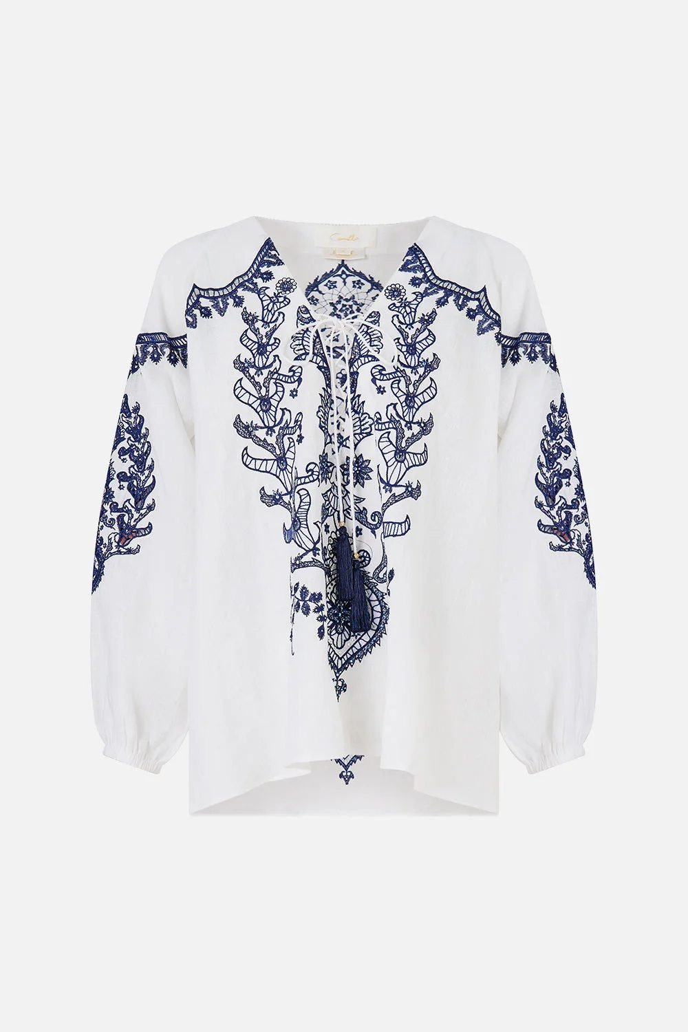 The Isnik Lullaby Lace Up Blouse is a handcrafted linen silhouette designed by our in house artisans. Reimagined in an exclusive limited edition print, our relaxed fitting blouse features a lace-up front detail that is adorned with tassel accents and softly gathered raglan sleeves. Woven with artisanal detail, this lace up blouse is finished with delicate cuffs. - 100% Linen - Lace Up Front - Raglan Sleeves With Cuffs - Tassels - Relaxed Fit SKU 00036551-ISNILULL-XS Size and Fit Our model is 5'10 (178cm) tall and wears a size S (AU 10). Bust: 40in (101.6cm) Waist: 26.5in (67cm) Hips: 38in (96.5cm) Fabric and Care 100% LINEN Made from flax fibres, this lightweight natural fibre offers a timeless aesthetic that adds durability and longevity to any wardrobe. Its breathability keeps your skin cool, minimises moisture and ensures effortless comfort.