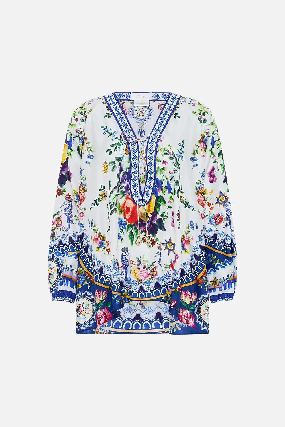 Designed in Australia, the Tiles Darls Lace Up Blouse reads the language of florals and tiles, blue and orange hues intertwine, a celebration of artisan hands and enduring beauty. Lovingly handcrafted, this luxury silk blouse showcases an effortlessly relaxed fit throughout the body accompanied by romantic blouson sleeves that taper into adjustable elastic encased cuffs. - Crystal Embellishment - Narrow Cuffs - Raglan Sleeves - Relaxed Fit SKU 00034877-TILEDARL-XS Size and Fit Designed as a relaxed fit—take your normal size, or select one size smaller for a neater fit. Fabric and Care 100% SILK Silk twill is renowned for its diagonally-patterned weave and fluid texture. Its high thread count ensures rich density and durability, while its beautiful sheen provides a luscious touch to the skin.