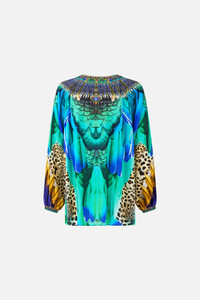 The Jungle Flight Lace Up Blouse is a handcrafted silk silhouette designed by our in house artisans. Reimagined in an exclusive limited edition print, this blouse is cut in a relaxed fit and features a delicate lace up V neckline with CAMILLA decorated tassels. It's adorned with raglan sleeves with tapered cuffs which add romantic movement to this feminine piece. - 100% Silk - Lace Up Front - Raglan Sleeves With Cuffs - Tassels - Relaxed Fit - Crystal Embellishment SKU 00041137-JUNGFLHT-XS Size and Fit Our model is 5'10 (178cm) tall and wears a size S (AU 10). Bust: 40in (101.6cm) Waist: 26.5in (67cm) Hips: 38in (96.5cm) Designed as a relaxed fit. Take your normal size, or select one size smaller for a neater fit. Fabric and Care 100% SILK With its subtly textured surface, silk crepe is our core fabrication made perfect for versatile wear. With its ability to hold alternative ways to wear, this decadent fabric drapes elegantly off the body whilst keeping you cool with its breathable nature.