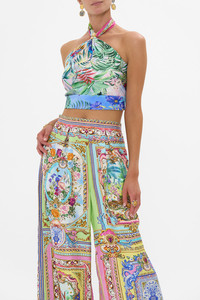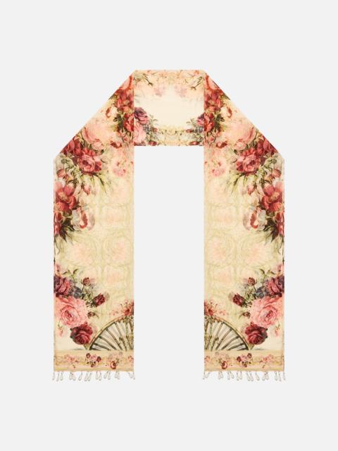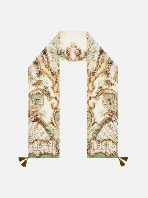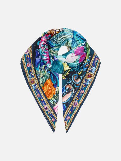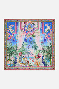 Designed in Australia, the Spirit Of Santa Maria Large Square Scarf dances in pastel hues and vibrant painterly graphics, inspired by the electric beauty of Igreja Matriz De Santa Maria and its radiant frescoes. Lovingly handcrafted, this luxury silk scarf features a large expanse adorned with a bespoke print and crystal embellishments. Wear tied as a fitted summer strapless or halter top, drape around the neck or shoulders as lavish layering, or wear over swim as a resort wear shrug or sarong. This luxury silk scarf is the ultimate statement style piece. - Crystals - Printed Silk - Contrast Border - 107CM X 107CM SKU 00035196-SPIRMARI-O/S Fabric and Care MAIN: 100% SILK Silk twill is renowned for its diagonally-patterned weave and fluid texture. Its high thread count ensures rich density and durability, while its beautiful sheen provides a luscious touch to the skin.
