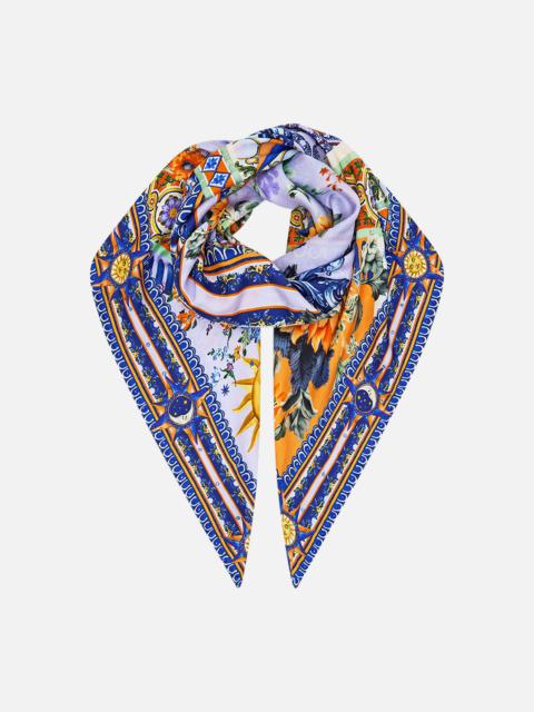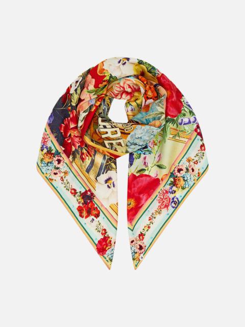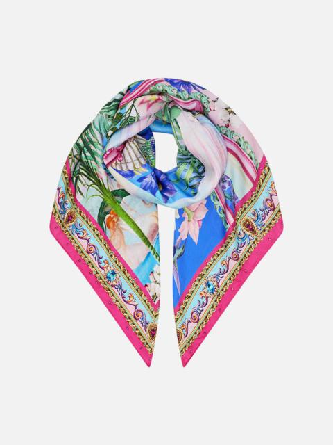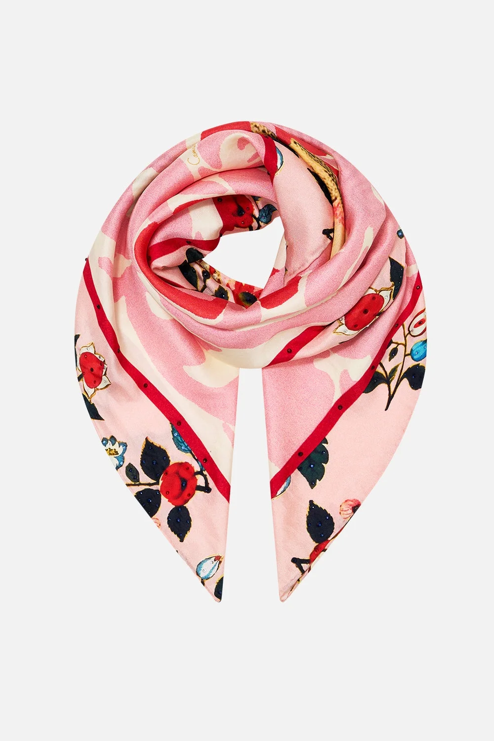 Designed in Australia, the Pink Porto Large Square Scarf refines blossoming romance, floral gardens dance along pastel pink mosaics kissed with red touches. Lovingly handcrafted, this luxury silk scarf features a bespoke print adorned with crystal embellishments. Multi-wear, tie and style as a summer strapless or halter top or draped around the neck or shoulders for lavish layering. Wear with swim as a resort wear cover-up or sarong. This luxury silk scarf is the ultimate statement style piece. - Crystals - Printed Silk - Contrast Border - Multi-wear SKU 00035191-PINKPORT-O/S Fabric and Care MAIN: 100% SILK Silk twill is renowned for its diagonally-patterned weave and fluid texture. Its high thread count ensures rich density and durability, while its beautiful sheen provides a luscious touch to the skin.