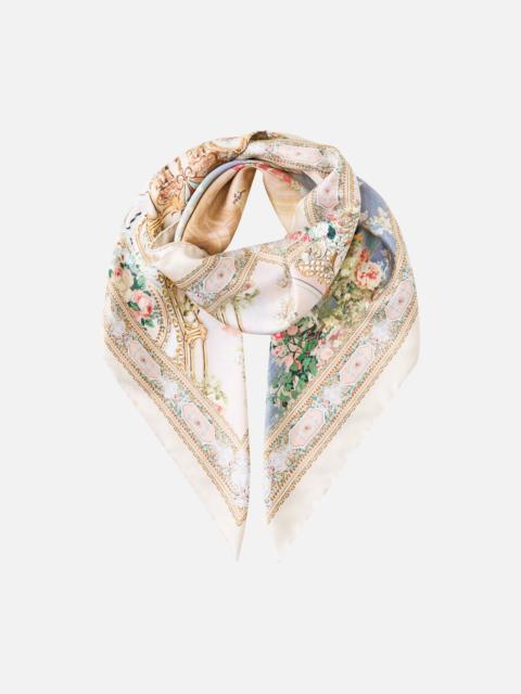 The Bazaar Blooms Large Crystalled Silk Square Scarf is a handcrafted silk silhouette designed by our in house artisans. Reimagined in an exclusive limited edition print, our luxurious silk scarf is decadently detailed with crystal embellishment and a contrast border. Designed to be worn in more ways than one, discover how she shapeshifts into lavish layering, resort wear and fitted tops with our CAMILLA Style Guide. - 100% Silk - Crystals - Printed Silk - Contrast Border - 107cm X 107cm SKU 00039205-BAZABLOM-O/S Size and Fit Our model wears a CAMILLA O/S and is 5'10 (178cm) tall. Her standard dress size is an AU 10. She has a 32in (83cm) bust, 35in (89.5cm) hips and a 25in (66cm) waist. Fabric and Care MAIN: 100% SILK
