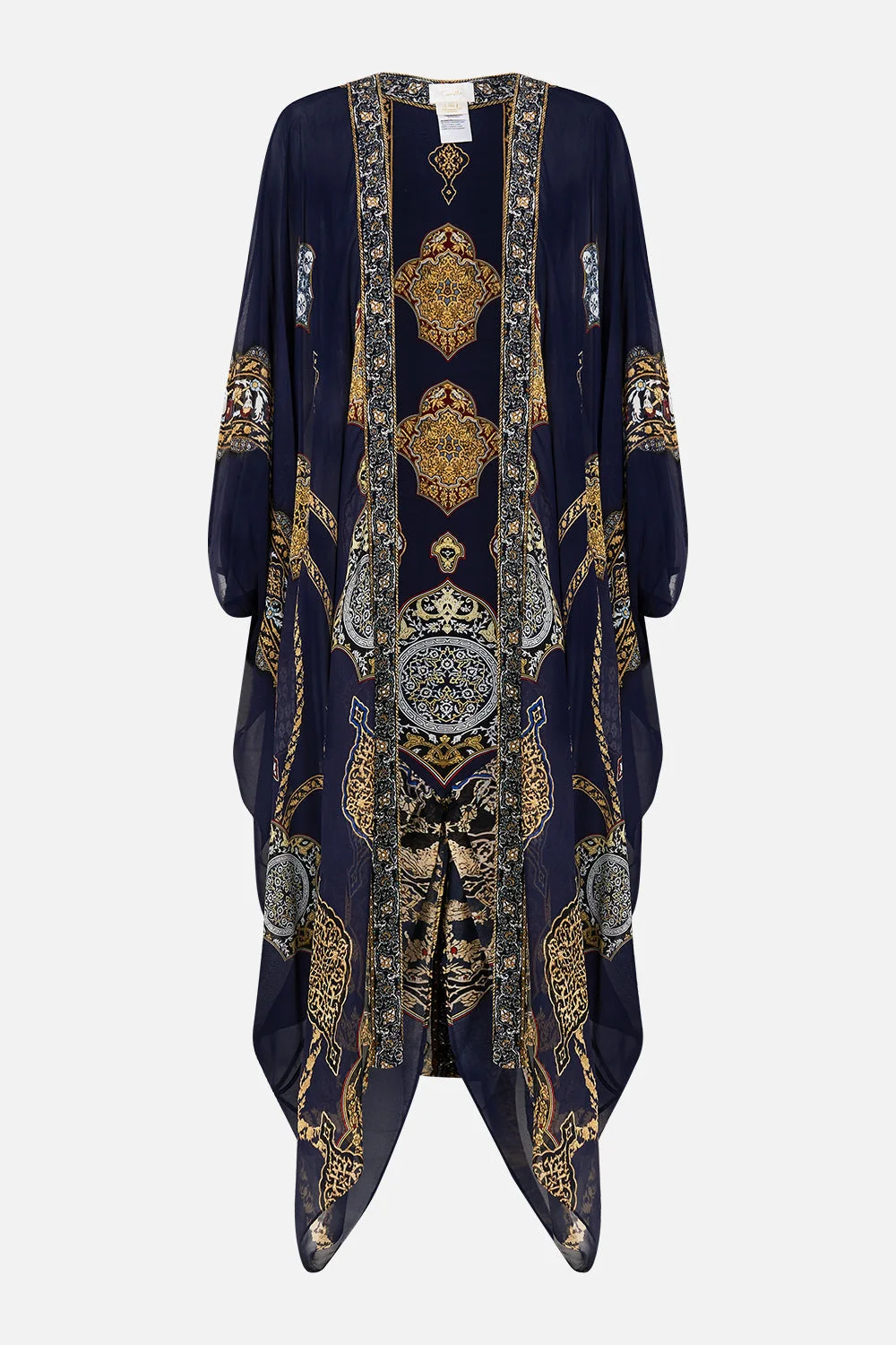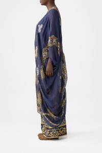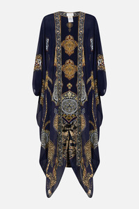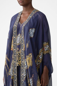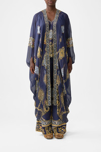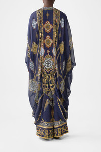 The The Imperial Gate Layer With Centre Back Panel is a handcrafted silk silhouette designed by our in house artisans. Reimagined in an exclusive limited edition print, our layer is crafted for comfort and contrast, featuring a heavily embellished back panel that falls to a decadently draped hemline. Effortlessly elevated with generous long sleeves, it's finished with intricately placed crystal embellishments. - 100% Silk - Relaxed Fit - Draped Hem - Long Sleeve - Heavily Embellished Centre Back Panel SKU 00036600-IMPEGATE-O/S Size and Fit Our model wears a CAMILLA O/S and is 5'10 (178cm) tall. Her standard dress size is an AU 10. She has a 32in (83cm) bust, 35in (89.5cm) hips and a 25in (66cm) waist. Designed as a one size fits all, in an oversized fit. Fabric and Care 100% SILK A featherlight, sheer, material renowned for its delicate flow and graceful drape, silk flat chiffon creates a softly cascading silhouette with a subtle lustre.