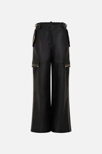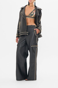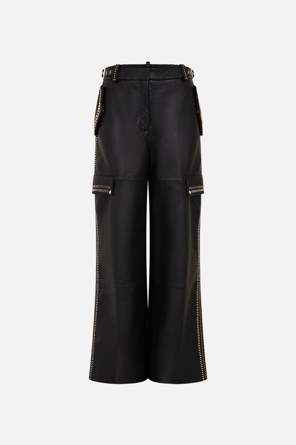 Devoting four days dedicated to intricate stud work and two days of expert hand stitching, this pinnacle of fine leather craftsmanship echoes superb quality. Crafted from rich premium lamb leather, these ornate pants are sumptuous to the touch - embodying fine artisan mastery. This treasure is 1 of 30 rare and resplendent designs. The They Call Her Nefertari Leather Utility Pant unveils lustrous gold embellishments ornamented on sumptuous leather. This luxury leather pants feature a high waisted silhouette that flows into a sumptuous wide leg trouser. Adorned with side pockets and statement utility pockets this statement leather pants are a limited edition treasure to cherish forever. Explore more from the House Of The Sun collection. - Lovingly Handcrafted - Designed in Australia - CAMILLA Ready-To-Wear - Regular fit - Pocket details - Camilla branded buckle detail - Front zip fly - Elastic back waist - Wide leg trouser - Limited edition collector's piece SKU 00033064-THEYCALL-S Size and Fit Our model wears a CAMILLA S and is 5'10 (178cm) tall. Her standard dress size is an AU 10. She has a 32in (83cm) bust, 35in (89.5cm) hips and a 25in (66cm) waist. Camilla S = AU10 / UK10 / US6 Designed as a true to size fit take your normal size Fabric and Care 100% LAMB LEATHER