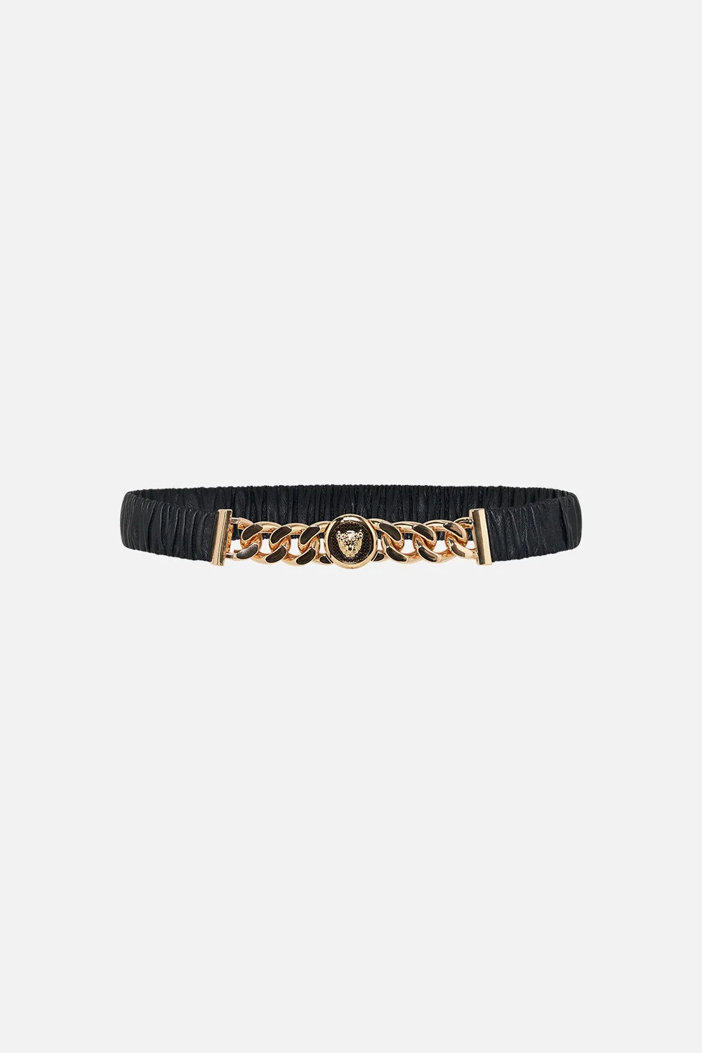 Designed in Australia, The Solid Black Leopard Button Elastic Belt shimmers with signature monograms upon a decadent black backdrop. Lovingly handcrafted this belt is adorned with a leopard button chain detail, leather gilded elastic, and a gleaming gold clasp closure. This accessory embodies unmatched elegance and refined luxury. - Leopard Button Chain Detail - Black Leather Covered Elastic - Gold Clasp Closure - Width = 3cm S = Approx 72-77cm M = 75-79cm L = 97-101cm - - SKU 00027841-SOLIDBLA-S Fabric and Care 100% LEATHER