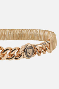 Designed in Australia, The Gold Leopard Button Elastic Belt Moves through regal gold hues and embellishments. Lovingly handcrafted this belt is adorned with a leopard button chain detail, leather gilded elastic, and a gleaming gold clasp closure. This accessory embodies unmatched elegance and refined luxury. - Leopard Button Chain Detail - Gold Leather Covered Elastic - Gold Clasp Closure - - - SKU 00027840-GOLDSUNG-S Fabric and Care MAIN: 100% LEATHER