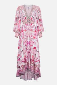Designed in Australia, The Botanical Novella Long Button Front Dress encapsulates a timeless elegance with butterflies delicately settled amid vivid palace florals, framed by arches and gilded borders. Lovingly handcrafted, this alluring silk maxi dress features a slightly relaxed fit throughout the body that cinches into the adjustable waistline. The flowy maxi skirt falls into an elegant flare with a double ruffle hemline for a feminine flounce, while the romantic blouson sleeves taper into a wide shirred cuffs. - Full Length - Double Ruffle Hem - Shirred Elastic Back Waist - V Neckline - Crystal Embellishment SKU 00031773-BOTANOVL-XXS Size and Fit Our model wears a CAMILLA S and is 5'10 (178cm) tall. Her standard dress size is an AU 10. She has a 32in (83cm) bust, 35in (89.5cm) hips and a 25in (66cm) waist. Camilla S = AU10 / UK10 / US6 Designed and fitted true to size, take normal size. Fabric and Care SELF-100% SILK CONTRAST-100% SILK With its subtly textured surface, silk crepe is our core fabrication made perfect for versatile wear. With its ability to hold alternative ways to wear, this decadent fabric drapes elegantly off the body whilst keeping you cool with its breathable nature.