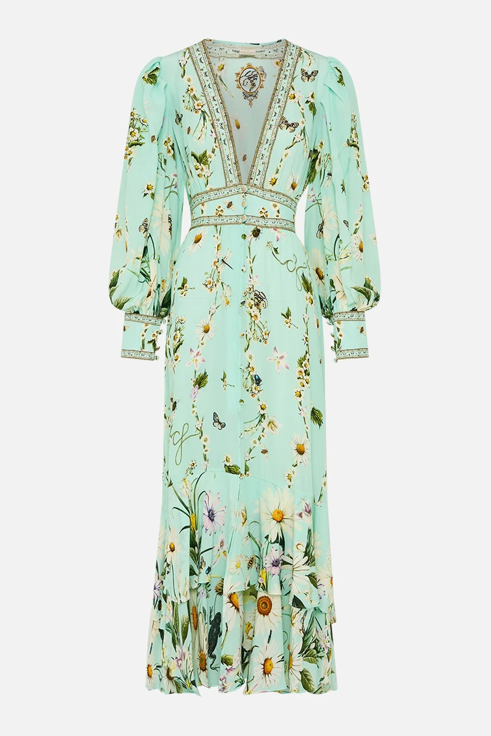 Designed in Australia, the Floral Freefall Long Button Front Dress floats on a dreamscape of baby blue and purple. Botanical motifs cascade across embroidered textiles, capturing the poetry of wildflower fields. Lovingly handcrafted, this alluring silk maxi dress features a slightly relaxed fit throughout the body that cinches into the adjustable waistline. The flowy maxi skirt falls into an elegant flare with a double ruffle hemline for a feminine touch, while the romantic blouson sleeves taper into a wide shirred cuffs. - Long Length - Double Ruffle Hem - V Neckline - Shaped Waistband With Elastic Back - Button Front SKU 00037819-FLORFREE-XXS Size and Fit Designed and fitted true to size, take your normal size. Fabric and Care 100% SILK With its subtly textured surface, silk crepe is our core fabrication made perfect for versatile wear. With its ability to hold alternative ways to wear, this decadent fabric drapes elegantly off the body whilst keeping you cool with its breathable nature.
