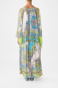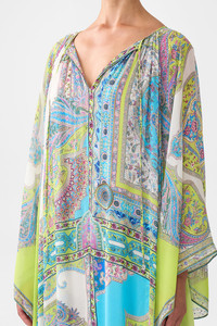 The Magic Carpet Ride Long Dress With Handkerchief Sleeve is a handcrafted silk silhouette designed by our in house artisans. Reimagined in an exclusive limited edition print, this maxi dress is relaxed fitting and features generous handkerchief sleeves that drape effortlessly beside the body. It's framed by a gathered neckline and is adorned with ties that are finished with opulent CAMILLA tassel charms on the ends. - 100% Silk - Relaxed Fit - Handkerchief Sleeves - Neckline Gathering - Front Neck Ties With Camilla Tassel Charms SKU 00036880-WOVEWOND-O/S Size and Fit Our model is 5'10 (178cm) tall and wears a size S (AU 10). Bust: 40in (101.6cm) Waist: 26.5in (67cm) Hips: 38in (96.5cm) Designed as a relaxed silhouette. Take your normal size, or select one size smaller for a neater fit. Fabric and Care 100% SILK Meticulously crafted with a tighter weave that enhances its structure, silk georgette showcases an ethereal, semi-sheer fabric with a delicate grainy texture, creating a soft bounce and decadent draping.