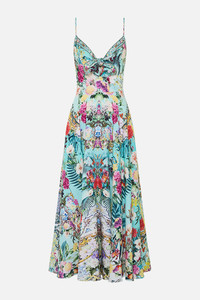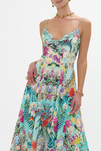 Designed in Australia, The Gardens Of Queluz Long Dress With Tie Front invites you into Queluz Palace, where vivid greens and lush florals blend with the elegance of Azulejo tiles, celebrating nature and artful design. Lovingly handcrafted, this luscious sundress features a fitted bodice with an adjustable tie front detail. The lowered waist seam flows into a circular flared skirt that dances at the ankles for romantic billow. - Full Length - Front Tie Closure - Crystal Embellishment - Invisible Side Zipper - Non-Sheer - Fitted Silhouette SKU 00033371-GARDQUEL-XXS Size and Fit Designed and fitted true to size, take your normal size Fabric and Care 100% LINEN Linen is a lightweight natural fibre that offers a timeless aesthetic, adding durability and longevity to any wardrobe. Its breathability keeps your skin cool, minimises moisture and ensures effortless comfort.