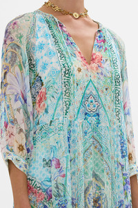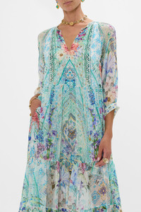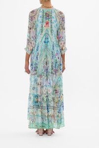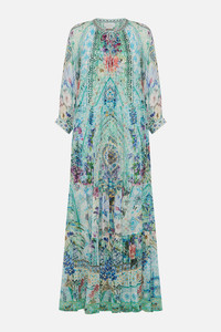 Designed in Australia, The Sunrise In Sintra Long Gathered Panel Dress celebrates lush gardens and eclectic nineteenth-century architecture, where light blues and intricate tiles reflect exotic motifs, inviting you into botanical beauty. Lovingly handcrafted, this luxury silk maxi dress features a relaxed fit throughout the body created by soft gathered tiers. The cropped 3/4 raglan sleeves fall into button-up cuffs for effortless elegance. - Crystal Embellishment - In Seam Pockets - Buttoned Cuffs - Relaxed Fit - Non-Sheer SKU 00034008-SUNRSINT-XXS Size and Fit Designed as a relaxed fit, take your normal size or select one size smaller for a neater fit Fabric and Care 100% SILK Silk crinkle chiffon is a sheer, lightweight fabric with a textured surface, crafted for a fluid drape with delicate stretch and a soft bounce.