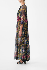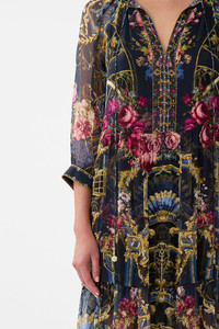 Designed in Australia, the Ornate On A Plate Long Gathered Panel Dress celebrates the opulence of Majestic Cafe. Contrasting navy and gold reflect its refined regal, a testament to dramatic disclosure. Lovingly handcrafted, this luxury silk maxi dress features a relaxed fit throughout the body created by soft gathered tiers. The cropped 3/4 raglan sleeves fall into button-up cuffs for effortless opulence. - Relaxed Fit - In Seam Pockets - Buttoned Cuffs - Crystal Embellishment - SKU 00039658-ORNAPLAT-XXS Size and Fit Our model wears a CAMILLA S and is 5'10 (178cm) tall. Her standard dress size is an AU 10. She has a 32in (83cm) bust, 35in (89.5cm) hips and a 25in (66cm) waist. Camilla S = AU10 / UK10 / US6 Designed as a relaxed fit—take your normal size, or select one size smaller for a neater fit. Fabric and Care 100% SILK Silk crinkle chiffon is a sheer, lightweight fabric with a textured surface, crafted for a fluid drape with delicate stretch and a soft bounce.