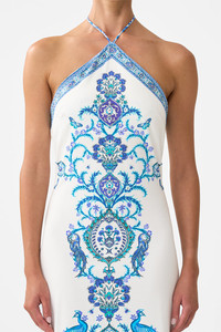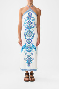 The Isnik Lullaby Long Jersey Halter Dress is a handcrafted cotton silhouette designed by our in house artisans. Reimagined in an exclusive limited edition print, our jersey maxi dress features a sculpting halter neckline, tie-back fastening and extended hemline that moves with intention. Cut to contour and celebrate the female form and finished with radiant crystal embellishment. - Halter Neck - Long Length - Tie Back - Crystal Embellishment SKU 00036534-ISNILULL-XS Size and Fit Our model is 5'10 (178cm) tall and wears a size S (AU 10). Bust: 40in (101.6cm) Waist: 26.5in (67cm) Hips: 38in (96.5cm) Designed and fitted true to size, take your normal size. Fabric and Care 95% COTTON 5%SPANDEX
