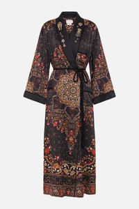The Loom To Tomb Long Robe With Flared Sleeve weaves an intricate world of traditional lotuses, floral and arabesque motifs upon a deep black backdrop. A luxury silk robe that features a relaxed fit flows into a midi length hemline. The slightly flared sleeves are adorned with decadent feather trims while the open shawl collar neckline can be worn closed and secured with the decadent waist tie. Explore more from the House Of The Sun collection. - Lovingly Handcrafted - Designed in Australia - CAMILLA Ready-To-Wear - Crystal embellishment - Fully lined - Feather trims - Side splits - Pockets - Shawl collar - Waist tie SKU 00030459-LOOMTTOM-O/S Size and Fit Our model wears a CAMILLA S and is 5'10 (178cm) tall. Her standard dress size is an AU 10. She has a 32in (83cm) bust, 35in (89.5cm) hips and a 25in (66cm) waist. CAMILLA Size S = AU10 / UK10 / US6 Our More to Love Model wears a CAMILLA Size 3XL and is 5'9 (182cm) tall. Her standard dress size is a AU 20. She has a 42in (107cm) bust, 35.8in (91cm) waist and 46in (118cm) hips. CAMILLA Size 3XL = AU20 / UK20 / US16 Designed as a relaxed fit take your normal size Fabric and Care 100% SILK