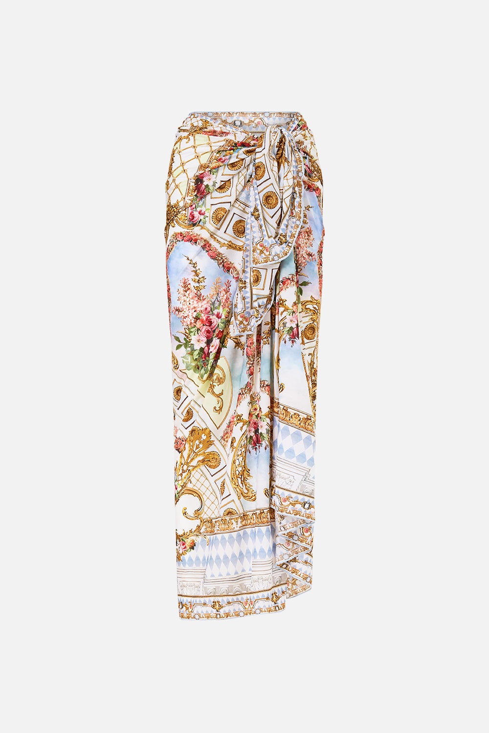 Designed in Australia, The Throne Games Long Sarong welcomes you to the Palace of Queluz, where ornate rococo details and fine architectural artistry are framed by an elegant floral border. Lovingly handcrafted, this luxury CAMILLA sarong wrap features relaxed fit that can be draped and tied at the side to create a chic column silhouette with a high slit. Wrap over luxury CAMILLA swimwear for elevated resort wear elegance. - Long Length - Multiwear - No Crystals - Tie Opening - Sheer SKU 00034103-THRNGMES-O/S Size and Fit Our model wears a CAMILLA O/S and is 5'10 (178cm) tall. Her standard dress size is an AU 10. She has a 32in (83cm) bust, 35in (89.5cm) hips and a 25in (66cm) waist. Designed as a relaxed fit, take your normal size or select one size smaller for a neater fit Fabric and Care MAIN: 34% NYLON, 34% RECYCLED NYLON, 32% ELASTANE
